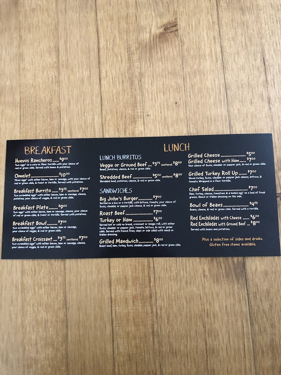 Two scrambled eggs, with either bacon or sausage, potatoes, cheese and your choice of veggie and red or green chile.