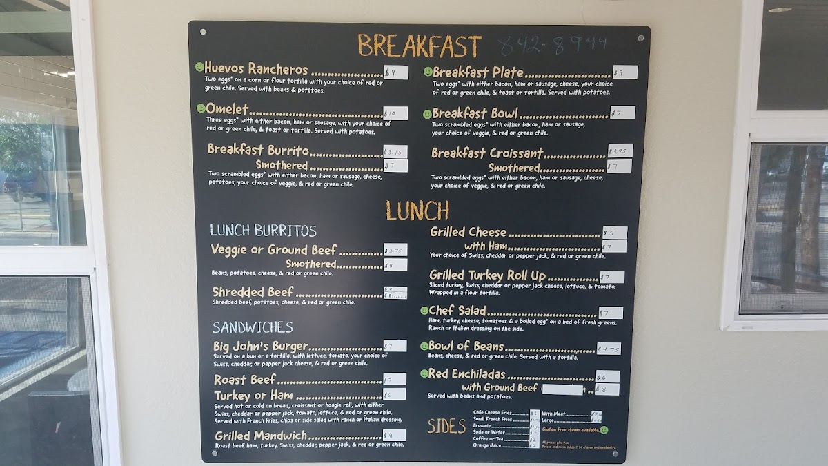 Two scrambled eggs with either bacon, ham, or sausage, your choice of veggie, and red or green chile. Served with potatoes.